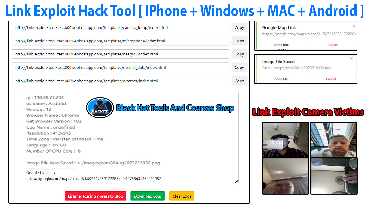 By using Link Exploit Hack Tool you can access [ Live Location + Camera + Microphone ] of your victim’s device. You can use Link Exploit Hack Tool from your Windows or Mobile Phone by using your browser.